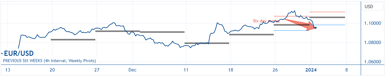 Monday, January 8, 2024 - EA Economic Sentiment DEC & EA Retail Sales MoM NOV: These readings will provide a snapshot of consumer confidence and spending in the Euro-Area. Positive data might indicate economic resilience, supporting the Euro, while disappointing figures could highlight economic challenges, possibly affecting the EUR/USD pair as they might prompt a more dovish stance from the ECB.