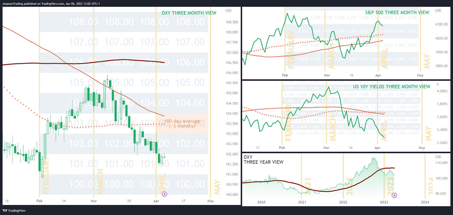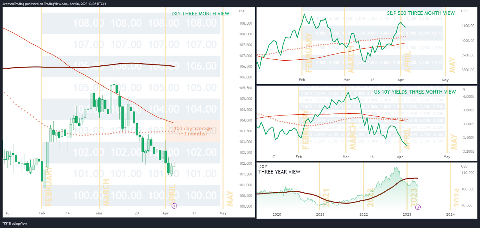 The Fed hike of 0.25 in March and the updated projections suggest that the Fed are not considering cuts in the near future as the peak 2023 rate suggested is 5.1 with a fall to 4.3 in 2024, however this is more hawkish than the 4.1 that was projected in December. The banking crisis following the collapse of SVB appears to have stabilised for now. Inflation is cooling quickly and unemployment is rising slowly suggesting that the hard landing is avoidable. The moving averages indicate that the stock market and 10Y yields are more optimistic. Sentiment is tilted towards a less hawkish Fed.