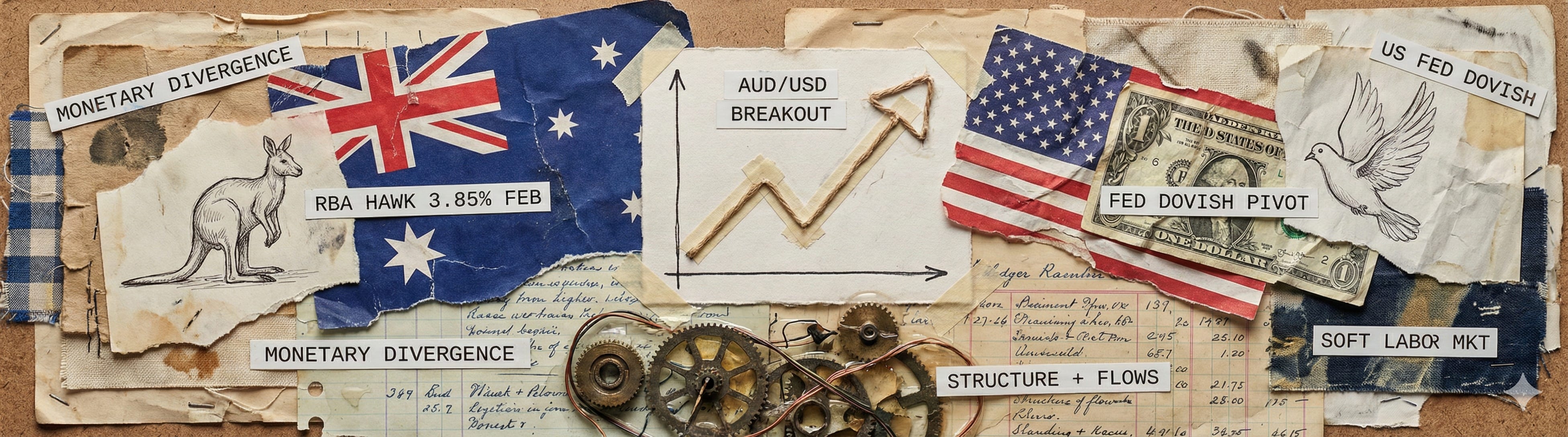 I’m aiming to catch a structural breakout of the AUD/USD as it moves higher. The stars are aligning here thanks to a mix of structure, fiscal flows, and widening monetary divergence. The RBA remains the “last hawk standing,” potentially lifting rates to 3.85% come February. This creates a stark contrast with the Federal Reserve, where a softening labor market makes a dovish pivot look increasingly likely.