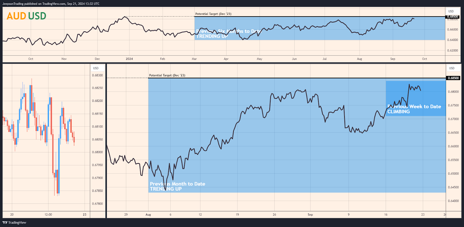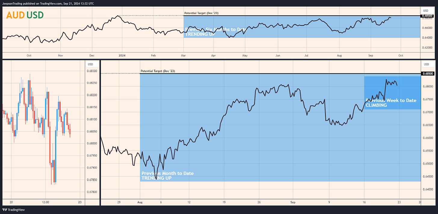 Currently, the AUD/USD is enjoying an upward trend. Driven by the recent global risk-on rally and fuelled by the Fed's rate cut, the pair is climbing, with a potential target of 0.685. This upward trajectory, evident in both the previous week and month-to-date trends, is a stark contrast to the broader downtrend observed over the past six months.