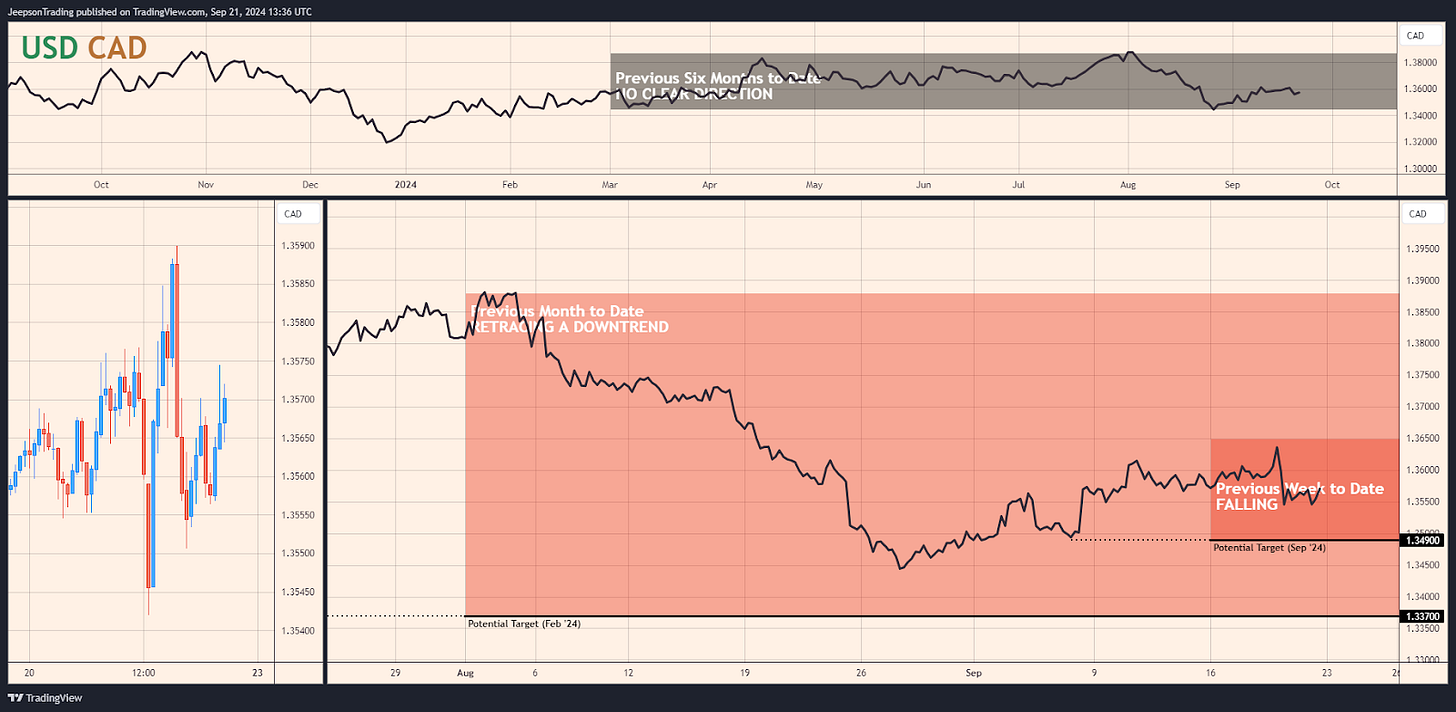 Over the past week and month, the USD/CAD has been on a downtrend, potentially heading towards 1.349 and 1.337, respectively. This decline reflects the combined forces of a weakening USD (courtesy of the Fed's rate cut and expectations of further easing) and surging oil prices. WTI and Brent crude have been rallying, driven by supply disruptions from Hurricane Francine and the prospect of a Fed-induced demand boost.
