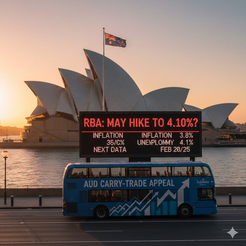The data tell a story of an economy running hotter than expected. Inflation at 3.8 percent and unemployment at 4.1 percent leave the RBA with no room to ease. The February 20 labour force data and February 25 CPI release will be the decisive inputs for the March 17 meeting. A sub-4.2 percent unemployment reading or a CPI print above 3.6 percent would cement expectations for a May hike to 4.10 percent, further supporting the AUD’s carry-trade appeal.