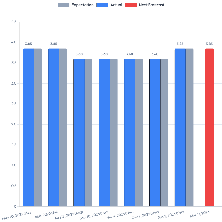 Next Meeting: March 16-17, 2026, with the decision announced at 2:30pm AEDT on March 17. Trading Economics Forecast: 3.60 percent for end-2026 (pre-hike model; post-hike pricing implies 4.10 percent by May) (https://tradingeconomics.com/australia/interest-rate). Market Consensus: Divided. NAB, CBA, and Westpac lean toward a May hike to 4.10 percent; ANZ expects an extended hold at 3.85 percent. Long-Term View: The RBA’s February 2026 SMP projects underlying inflation not returning to the 2 to 3 percent band until early 2027. Econometric models project a trend toward 3.60 percent in 2027 and 3.10 percent in 2028. Remaining 2026 meeting dates: May 4-5, Jun 15-16, Aug 10-11, Sep 28-29, Nov 2-3, Dec 7-8.