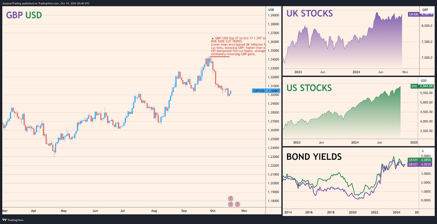 UK gilt yields have been rising. The 10-year gilt yield rose above 4.2% on October 10th, nearing three-month highs. This reflects investor unease about the upcoming budget. The gilt market will assess the budget’s implications for government borrowing and its impact on the pound. While higher yields might attract some foreign investment, benefiting GBP, overall economic concerns limit this potential upside.