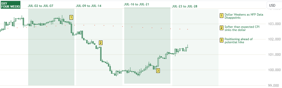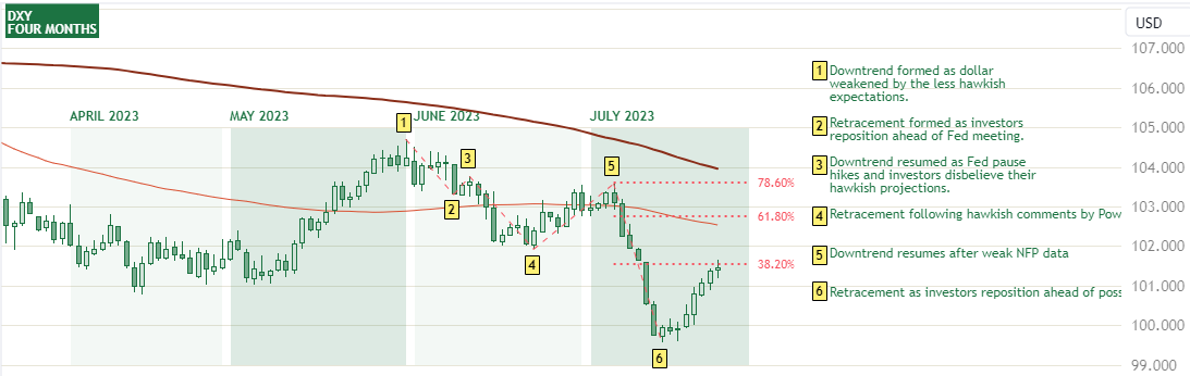 The US Dollar Index (DXY) has formed a downtrend since the start of June when investors began to price a lower peak rate which weakened the dollar. This dovish sentiment has been retraced three times as the Fed has not yet shown any signs that they will look to begin lowering rates in the near future. The DXY is currently retracing from the lows below 100.00 and is looking to test the 38.20% fib. A sustained move beyond the 78.60% level will break the downtrend