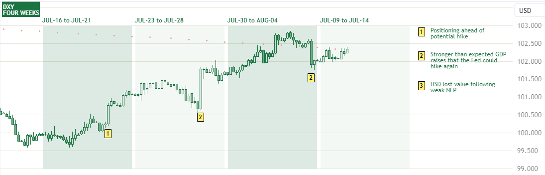 Value of the US Dollar Index (DXY) to remain above 101.5 unless the US CPI report comes in lower than expected on Thursday: The previous three week moves have been trending up from 99.50 to 102.9. Events this week are favoured towards a slightly stronger USD as the CPI is anticipated to rise.