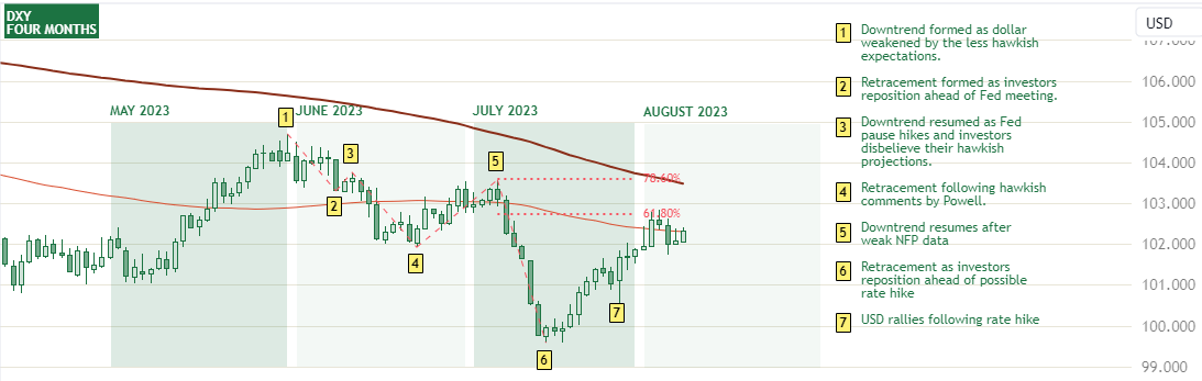 The US Dollar Index (DXY) has formed a downtrend since the start of June when investors began to price a lower peak interest rate which weakened the dollar. This dovish sentiment has been retraced three times as the Fed consistently remained hawkish. The DXY is currently retracing from the lows below 100.00 and testing the 61.80% fib. The downtrend will be broken on moves beyond the 78.60% level near 103.50.