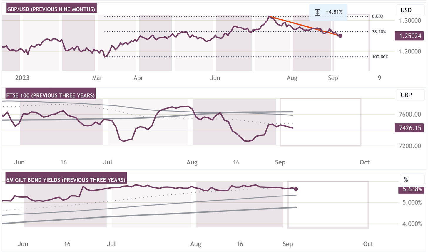 The GBP/USD has broken its uptrend and is now forming a downtrend with a recent fall of 4.8% to match the macroeconomic slightly bearish outlook. The fall is pressured by the strengthening dollar rather than a weakening pound. This sentiment is reflected in the steady moves of the FTSE 100 and stable yield on six-month gilt bonds which are holding above 5.6%.