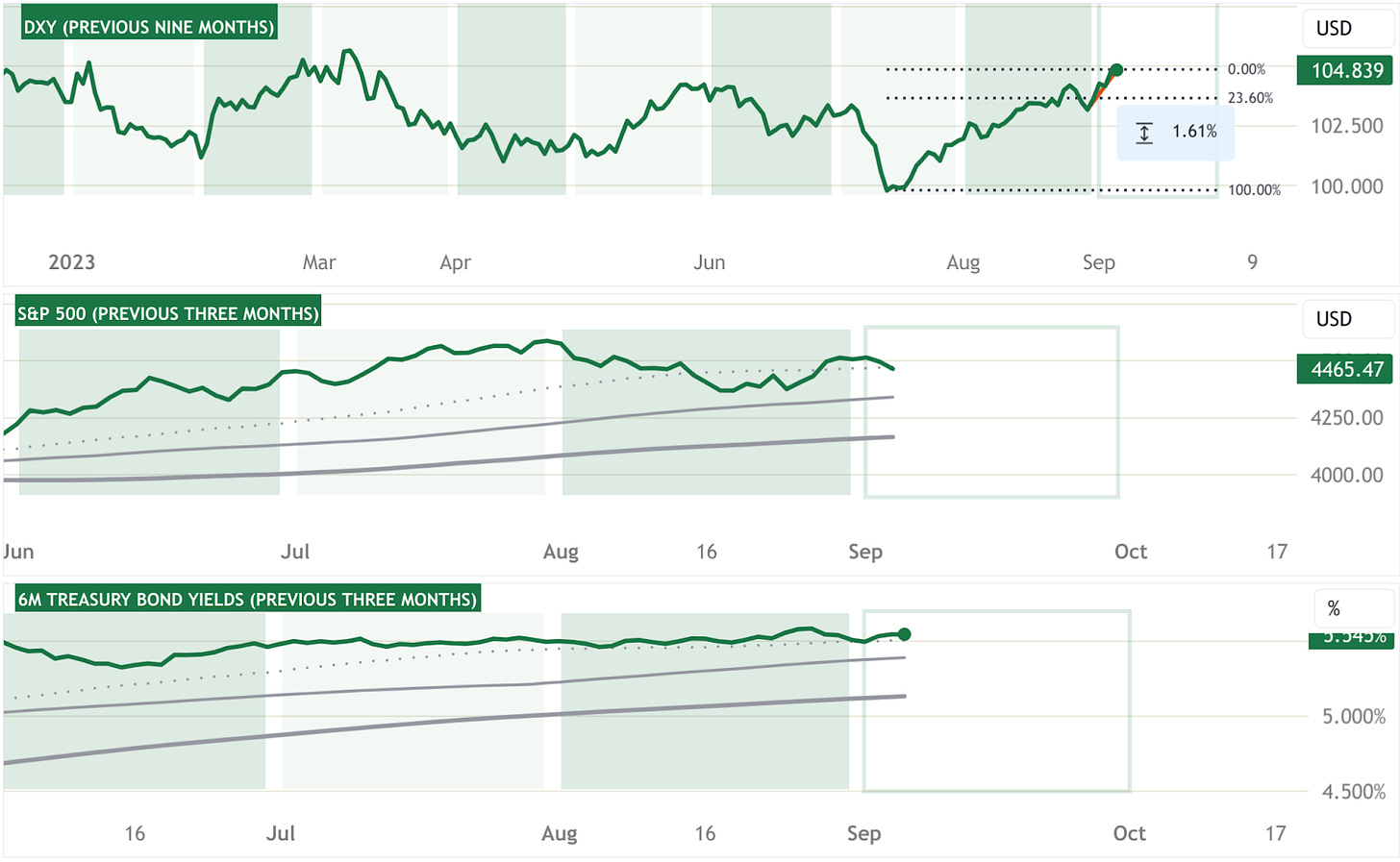 The US Dollar Index is extending its uptrend with a recent gain of 1.6% to match the macroeconomic bullish outlook. The gain is supported by last week’s NFP report and the risk-averse sentiment of investors who see the Fed holding rates higher-for-longer. This sentiment is reflected in the recent fall below the 50-day moving average of the S&P 500 while the yield on six-month treasury bonds remained steady above 5.5%.