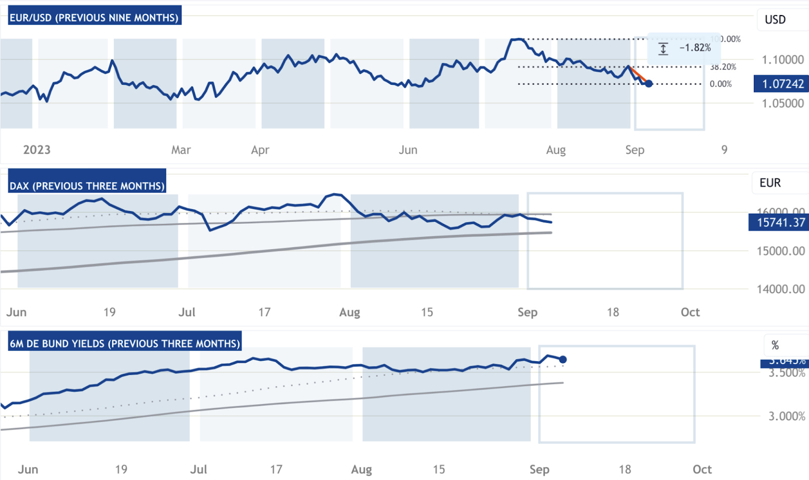 The EUR/USD is extending its downtrend with a recent fall of 1.8% to match the macroeconomic slightly bearish outlook. The fall is pressured by last week’s EA CPI report which showed a climb to 5.3% during August as well as a strengthening dollar. This sentiment is reflected in the recent fall below the 100-day moving average of the DAX while the yield on six-month German bunds remained steady above 3.6%.