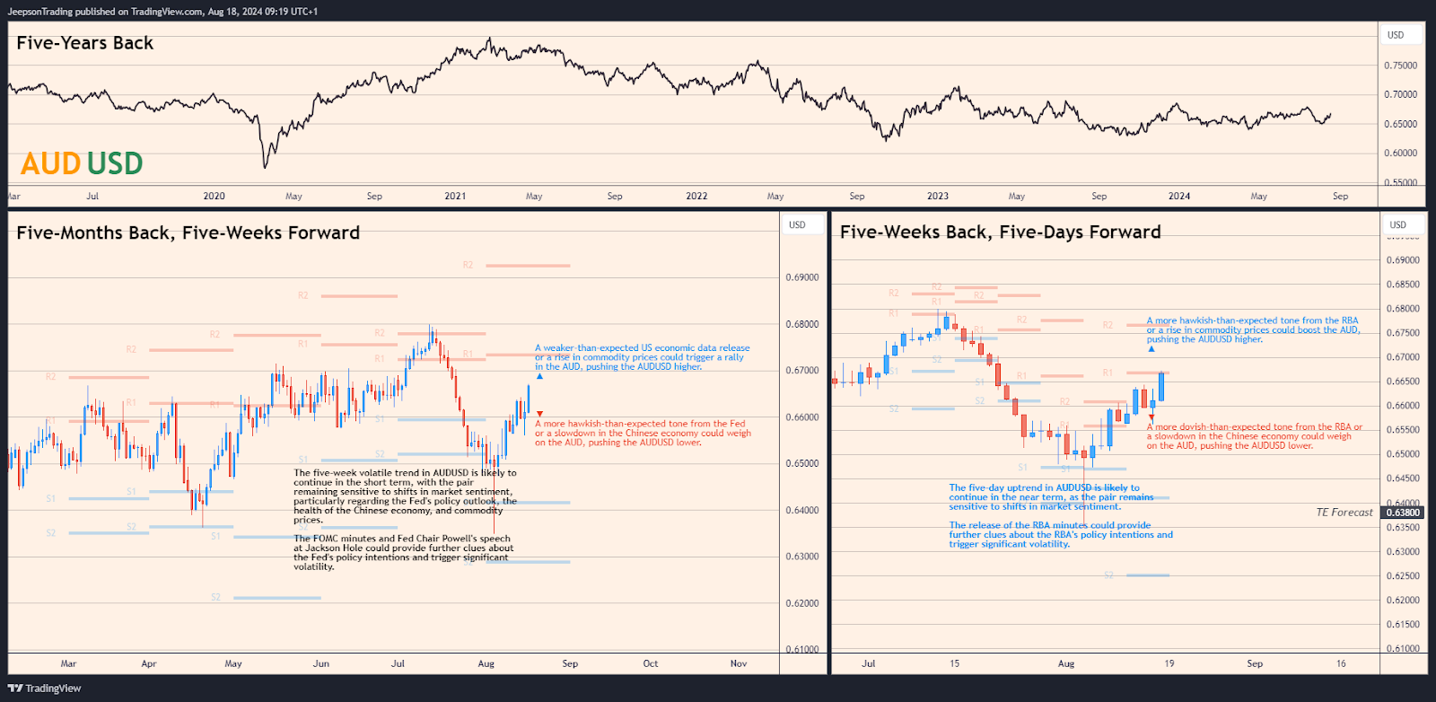 Over the past five weeks, the AUDUSD has also been volatile, reflecting uncertainty about the Fed's policy path and the outlook for the Australian economy. The pair found support around 0.649 in early August. The recent easing of US inflation data and the Fed's signal that it is now closer to pausing its tightening cycle have weakened the USD, supporting the AUDUSD.