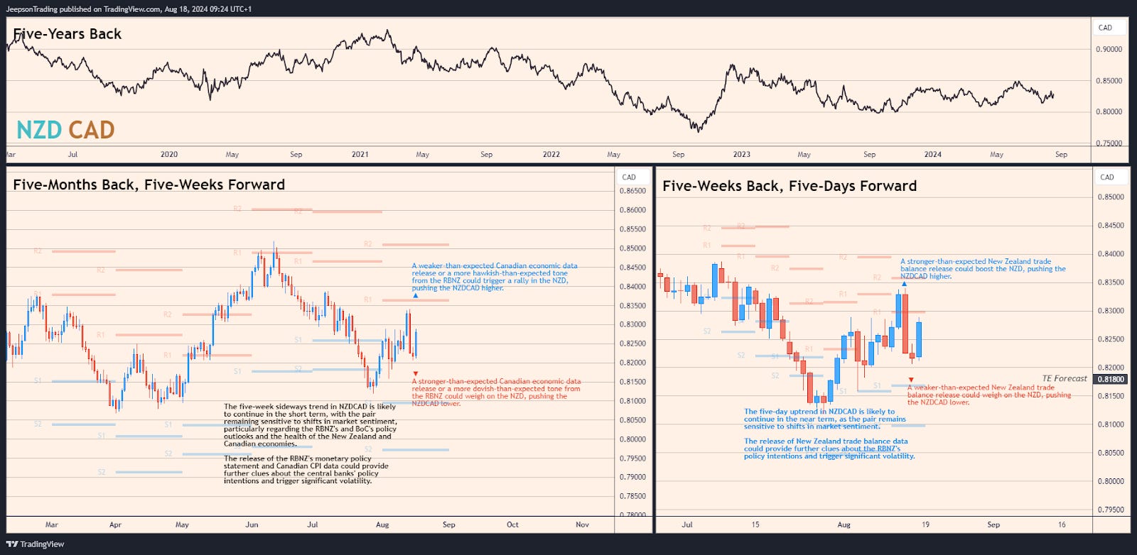 Over the past five weeks, the NZDCAD has been trading sideways, reflecting uncertainty about the RBNZ's policy path and the outlook for the New Zealand economy. The pair has traded within a range of 0.820 to 0.835, with no clear trend emerging. The RBNZ's recent rate cut and the weakening of the New Zealand economy have weighed on the NZD, while the weakening of the CAD amid concerns about the Canadian economy has provided some support.