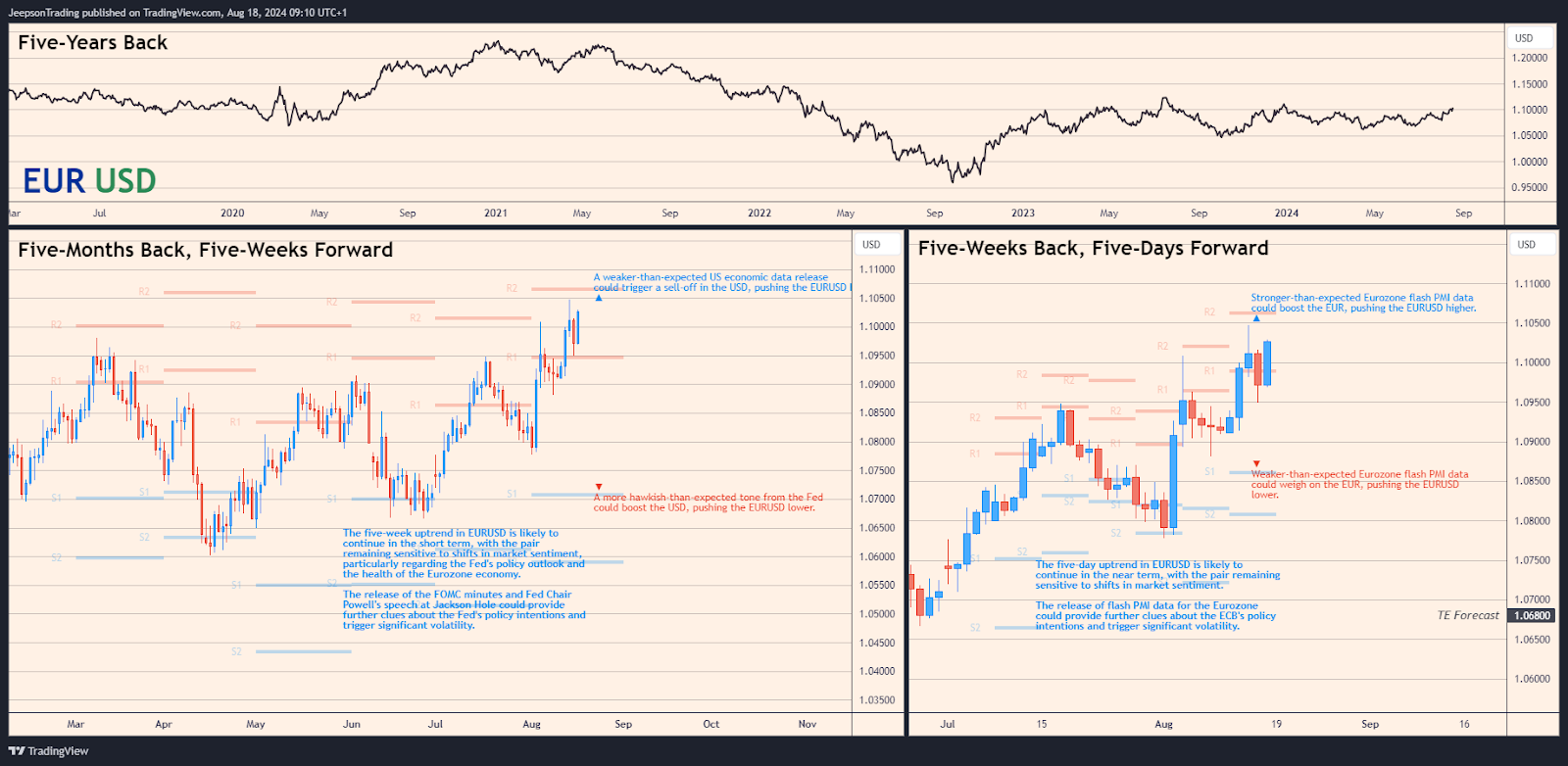 Over the past five weeks, the EURUSD has also been in an uptrend, reflecting the same factors driving the six-month trend. The pair has held above the 1.080 level, which acted as support in early July. The recent easing of US inflation data and the Fed's signal that it is now closer to pausing its tightening cycle have weakened the USD, supporting the uptrend in EURUSD.