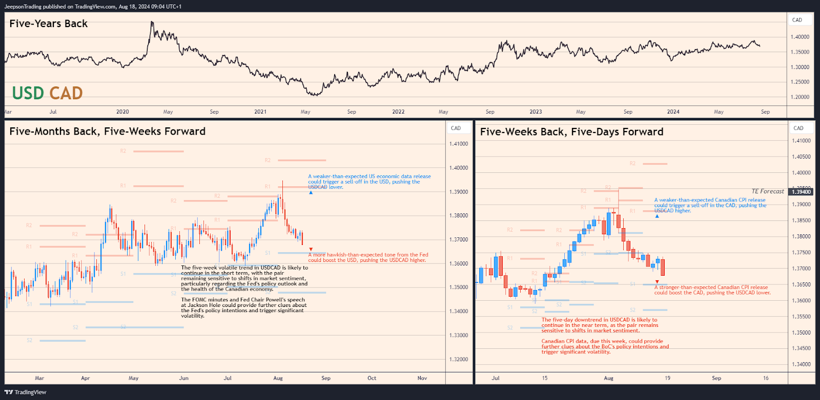 Currently, the USDCAD is trading around 1.370, reflecting a weakening Canadian dollar amid concerns about the country's economic outlook. The Canadian economy is facing headwinds from high inflation, a softening labour market, and slowing economic growth. This has led to speculation that the Bank of Canada (BoC) may need to cut interest rates further, which is weighing on the CAD.