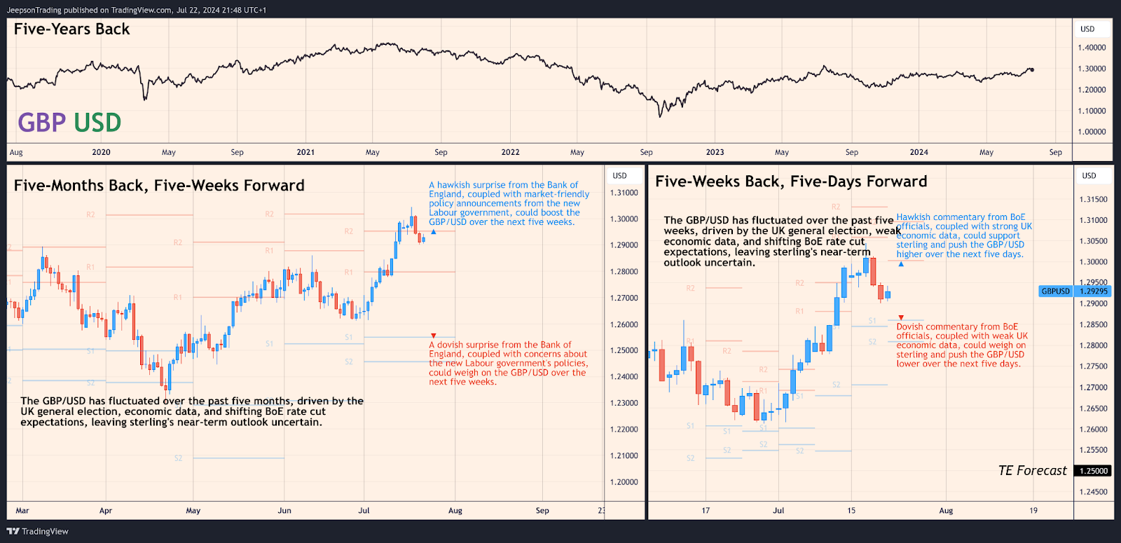 Summary: The GBP/USD has fluctuated over the past five weeks, driven by the UK general election, weak economic data, and shifting BoE rate cut expectations, leaving sterling's near-term outlook uncertain.