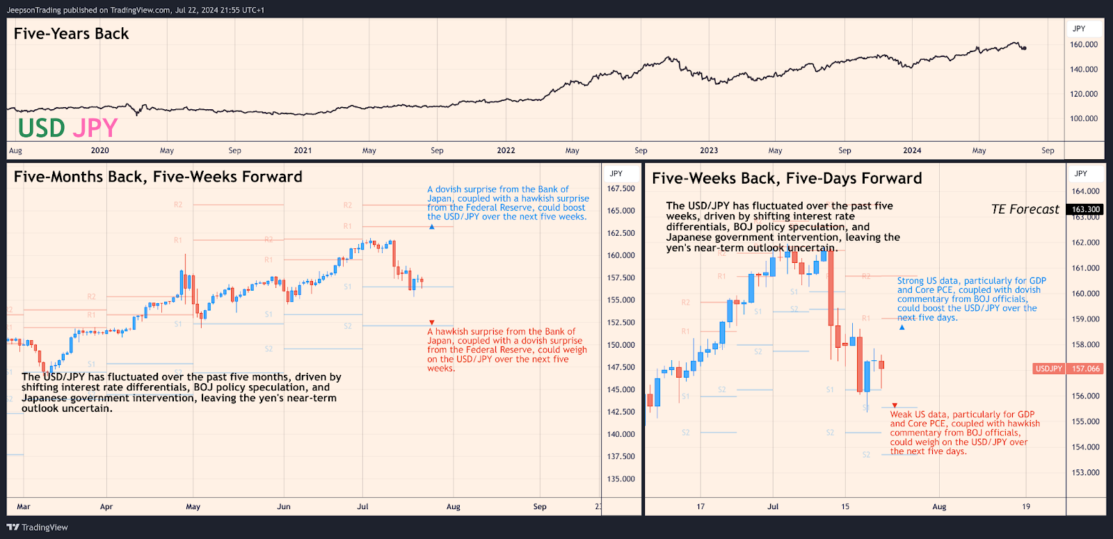 The USD/JPY has been on a wild ride over the past five weeks, driven by shifting interest rate differentials between the US and Japan, suspected government intervention, and speculation about the Bank of Japan's policy intentions. The pair initially strengthened, reaching a high of 158.095 on 20th June, as the Federal Reserve aggressively raised interest rates while the Bank of Japan maintained its ultra-loose monetary policy. However, the USD/JPY subsequently weakened, falling to a low of 155.6925 on 17th July, as the dollar weakened on growing expectations for a Fed rate cut in September and the BOJ signalled a potential shift towards policy normalisation.