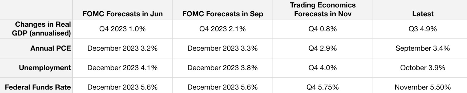 Changes in Real GDP (annualised) has a very pessimistic outlook compared to the FOMC’s forecast although the risk of a recession is minimal.