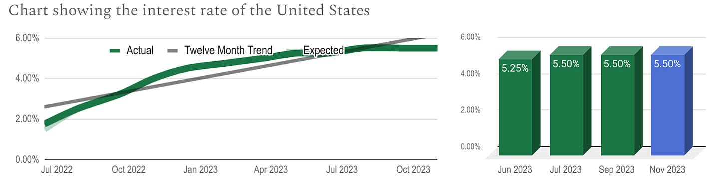 The interest rate of the US was held at the November meeting after being held in September but had been hiked throughout most of the previous twelve meetings. This indicates that the Federal Reserve is moving away from its ultra-hawkish stance as inflation has been falling quickly. Trading Economics forecast another hike to reach a peak of 5.75% and 2024 to see cuts to 5.25%.