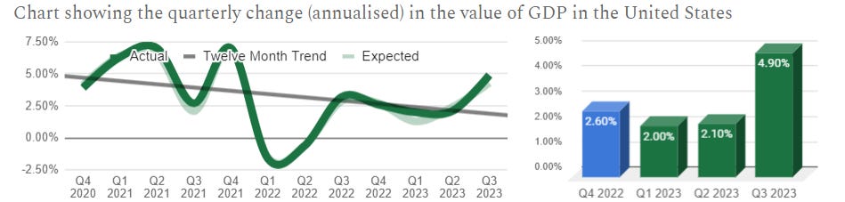 The latest result of 4.90% was far above expectations and signals that the economy is growing and at a fast pace as it is far higher than the previous quarter and far above the baseline trend.