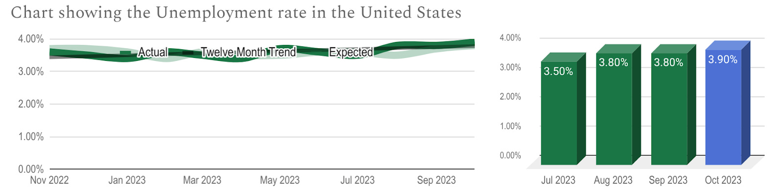 The US unemployment rate report measures the number of people actively looking for a job as a percentage of the labour force over a given month. The latest data covers the October period and was published on November 3rd by the Bureau of Labor Statistics and the next version is out on December 8th.
