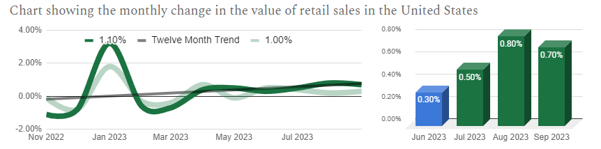 The US retail sales report measures the change in value of aggregated retail goods and services sales over a given month compared with the previous. The latest data covers the September period and was published on October 17th by the Census Bureau and the next version is out on November 15th.