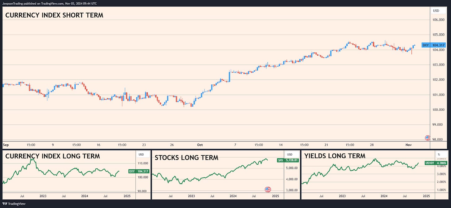The dollar demonstrated exceptional strength through October, achieving its strongest monthly performance since 2022 with a 3% gain. Credit Agricole identifies two primary scenarios driving current FX market positioning: a potential Harris presidency with divided Congress that could yield policy gridlock, or a "red wave" delivering both presidency and Congress to Republicans, potentially unleashing substantial fiscal stimulus alongside aggressive trade measures.