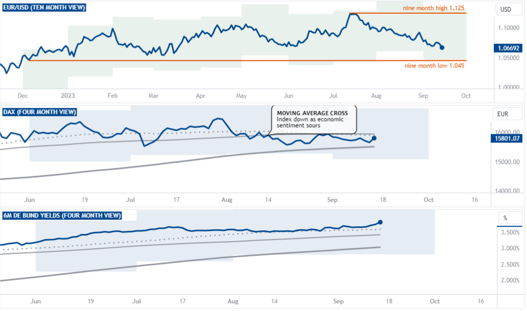 Intermarkets are reacting to the slightly pessimistic macroeconomic outlook with the DAX falling below the 100-day moving average and the yield on six-month German bunds climbing above 3.7%.