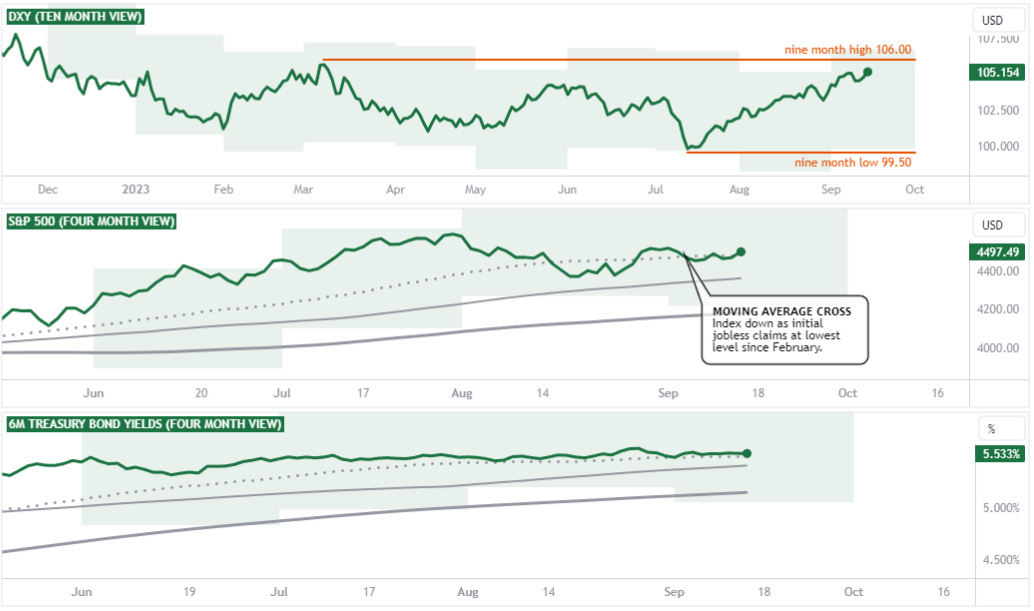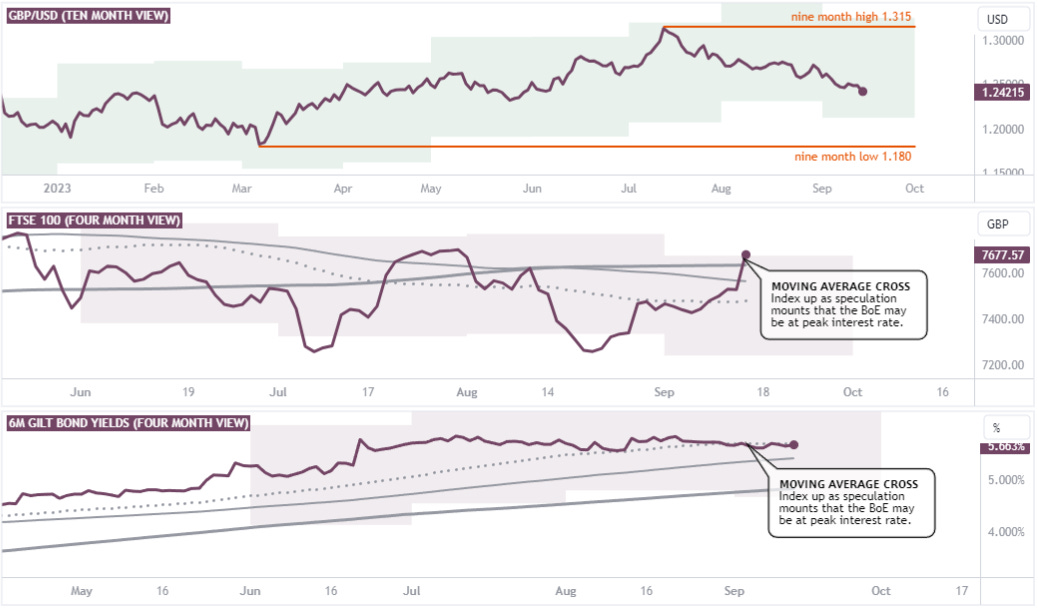 Intermarkets are rejecting the pessimistic macroeconomic outlook with the FTSE 100 above the 200-day moving average and the yield on six-month Gilt bonds holding around 5.7%.