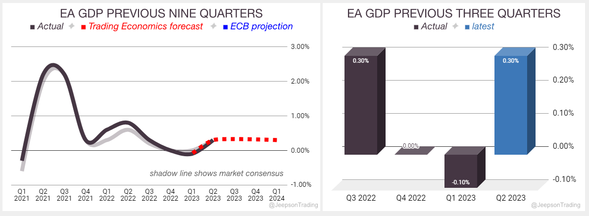 The latest report is below the Governing Council 2023 Real GDP forecast of 0.9% (revised down from 1.0%) and slightly below the Trading Economics Q3 ‘23 forecast of 0.4%.