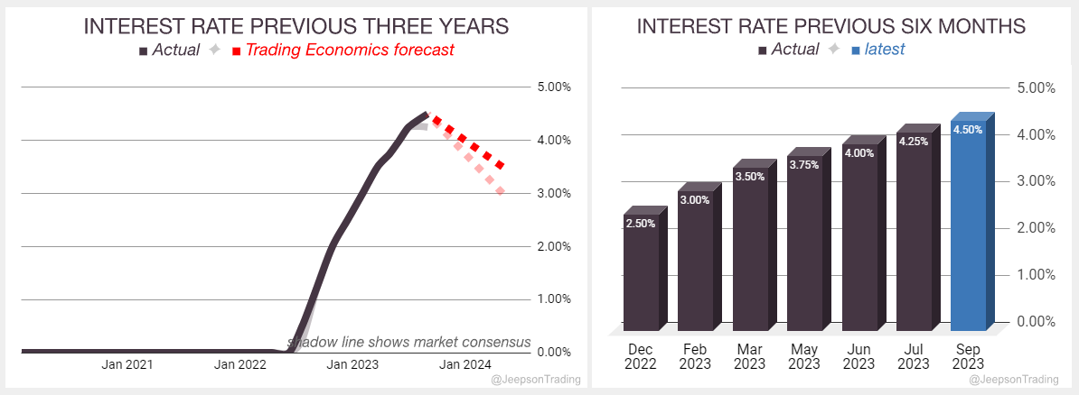 The latest rate now matches the Trading Economics Q3 ‘23 forecast of 4.50% which they also identify as the peak.