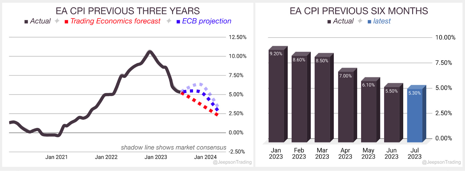 The latest report now matches the Governing Council 2023 HICP forecast of 5.3% although Trading Economics are more optimistic with a Q3 ‘23 forecast of 4.7%.