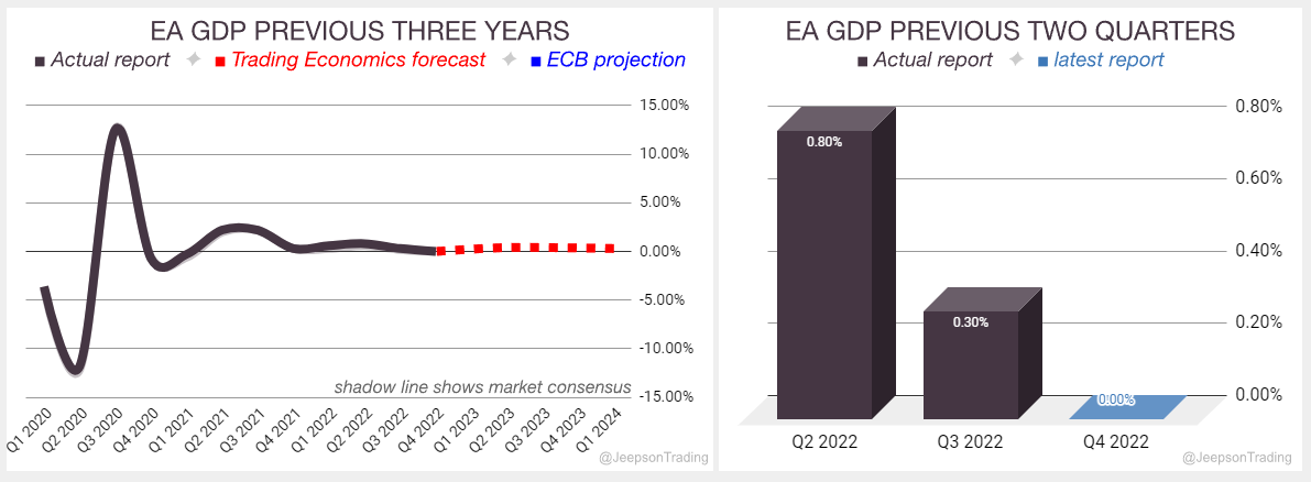 The eurozone economy grew by 0.0% in Q4 2022, matching expectations but slower than the 0.3% expansion in Q3. The slowdown has been attributed to the war in Ukraine, rising energy prices, and supply chain disruptions. The ECB projects growth to expand by 1.6% in 2024, down from 1.9% previously. Trading Economics forecasts Q2 growth of 0.4%. The Q1 2023 flash report is due on the Friday the 28th of April.