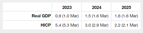 The June Governing Council macroeconomic projections for HICP in 2023 slightly raised to 5.4% inflation from 5.3% which was projected in March