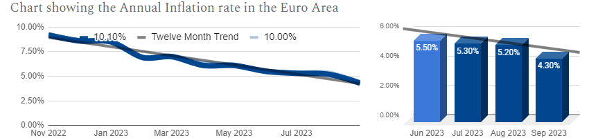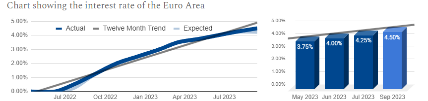 The interest rate of the EA was held at the October meeting to end the hiking cycle of 10 consecutive meetings. This ECB remains hawkish and although their focus remains on stamping out high inflation, they are increasingly more observant of the impact rates are having on growth. Trading Economics forecast 4.50% to be the peak rate and cuts to 4.00% to happen during 2024.
