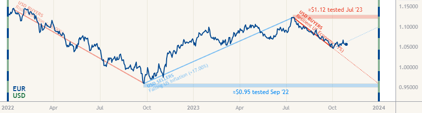 The EUR/USD has gained and lost value in a contrarian correlation with US inflation rates which peaked in late 2022. The current downtrend of the EUR/USD formed in July 2023 when investors began to reposition for the likelihood that the Fed will keep rates higher-for-longer due to the US economy being more resilient than anticipated.