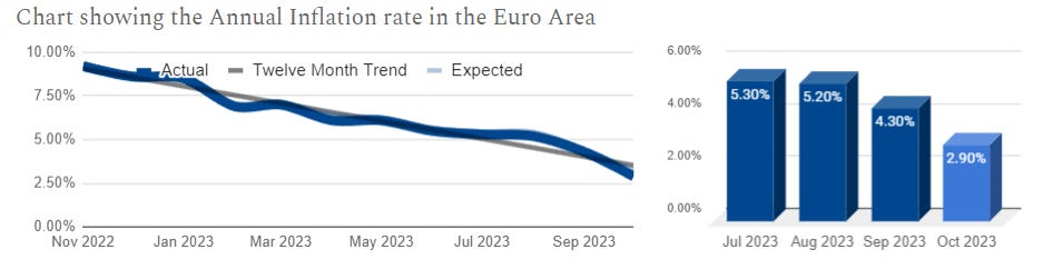 Inflation also fell at a faster pace in October, with the annual inflation rate dropping to 2.9%. This is below expectations and is reflective of reduced demand as the higher cost of living is hurting the purchasing power of consumers.