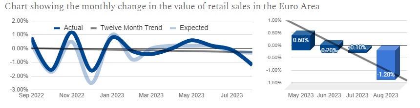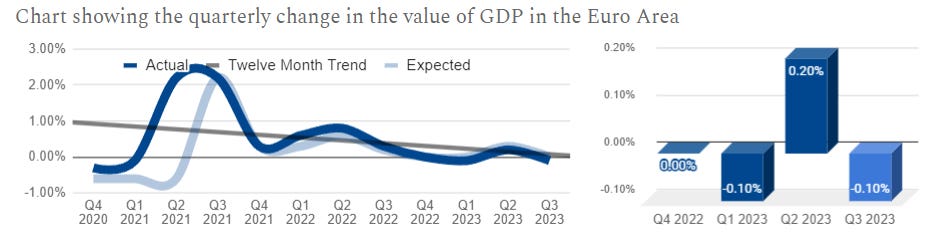 The Euro Area economy contracted in Q3 2023, with GDP growth falling to -0.1%. This is below expectations and raises the risk of a recession. The contraction was driven by a sharp decline in retail sales and a slowdown in manufacturing activity.