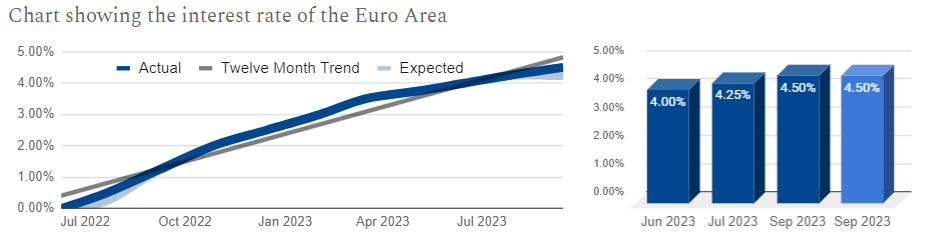 The interest rate of the EA was held at the October meeting to end the hiking cycle of 10 consecutive meetings. This ECB remains hawkish and although their focus remains on stamping out high inflation, they are increasingly more observant of the impact rates are having on growth. Trading Economics forecast 4.50% to be the peak rate and cuts to 4.00% to happen during 2024.