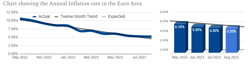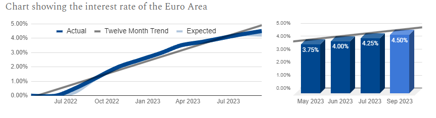 The interest rate of the EA was hiked at the September meeting by 0.25% after also being hiked by 0.25% in August and throughout almost all of the previous twelve meetings. This indicates that the ECB is hawkish and is focused on stamping out the high rate of inflation. Trading Economics forecast 4.50% to be the peak rate and 2024 to see cuts of 0.75%.