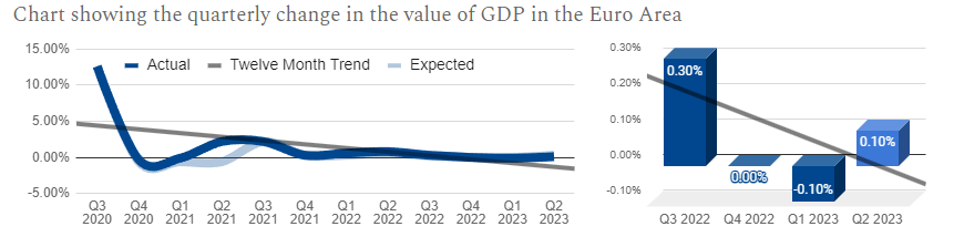 The European Central Bank raised interest rates to 4.50% in September, signalling its commitment to bringing inflation back to 2%, even if it means slowing economic growth. The euro area economy has slowed but still has a cautiously optimistic outlook, with recent GDP contractions expected to recover and unemployment expected to remain steady. Macroeconomic signals suggest a slightly bearish outlook for the euro, as the economy is slower than before and inflation remains high. Geopolitical events, such as the gas dispute with Russia and the war in Ukraine, are also adding uncertainty and putting downward pressure on the value of the euro.