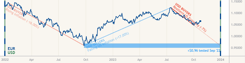 In the previous month, the EUR/USD has advanced this downtrend as economic indicators support the "Resilient US Economy" narrative.