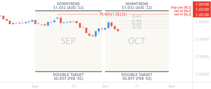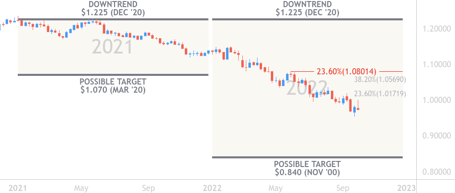 The downtrend is potentially looking to fall towards 0.84 USD which was previously tested over twenty-year ago in November 2000.