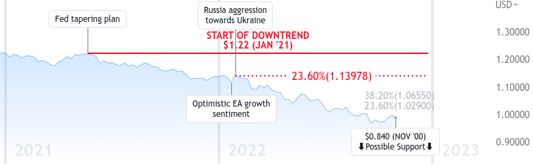 The downtrend fell to 1.11 where it then retraced higher as the sentiment on EA growth improved although this was temporary as the downtrend resumed in February as tensions between Russia and Ukraine escalated before an invasion at the end of the month.