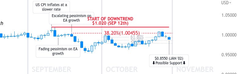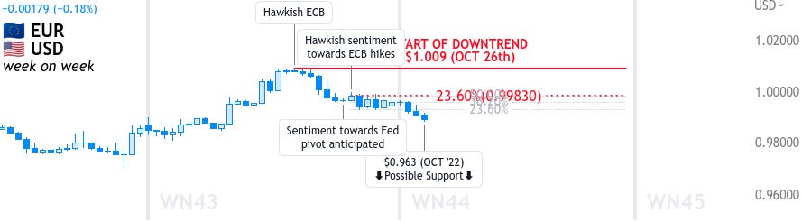 Price has since fallen as inflation looks to still be out of control, this meaning a pivot is less and less likely. The next potential support is at $0.963 which was last tested earlier in the month (October).