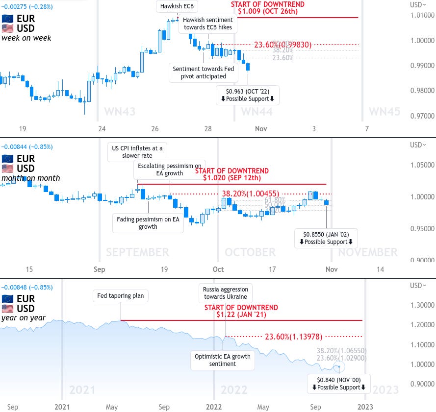 The micro term view (week on week) shows that the EUR/USD is downtrending from last week’s high of $1.009 when the ECB struck a hawkish tone at their policy meeting and provided another 75bps hike.