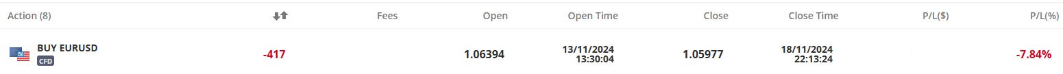 Last week gave the euro a beating, dropping from 1.093 to 1.071 as Germany's government fell apart when Chancellor Scholz fired his Finance Minister over budget fights and then Trump won the election. The markets are concerned about tariff plans on European goods. Looking ahead through December, we'll need to watch how Germany handles its political crisis and what moves Trump makes during his transition.