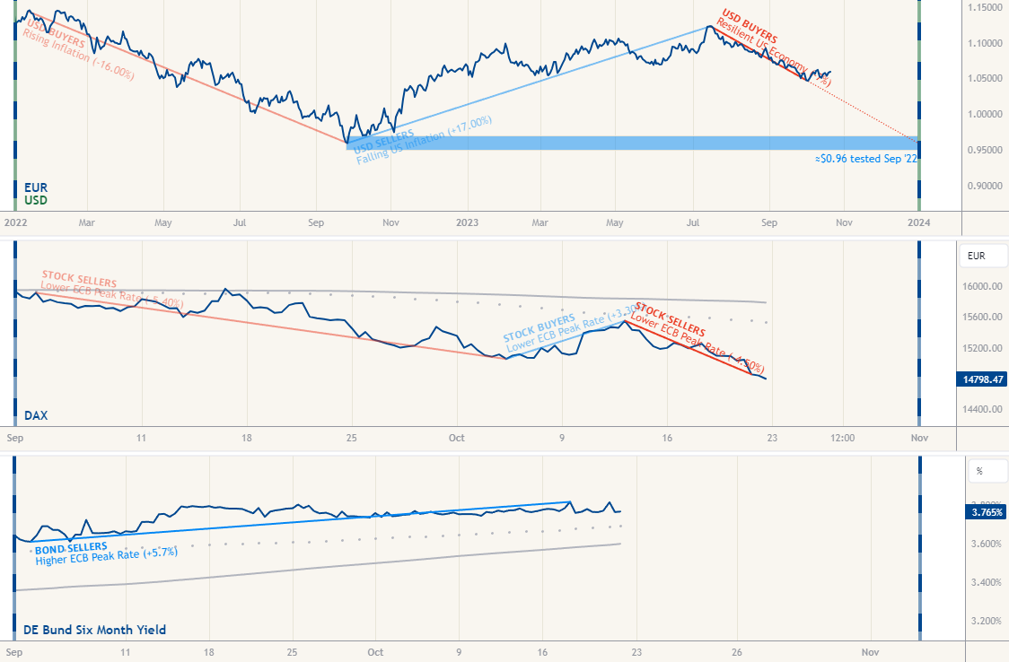 Derbyshire, UK – October 22nd, 2023: Study the Economic Events of Interest section below for hints on how to trade the upcoming week. The focus event of the week will be the ECB rate decision on Thursday where a hold is expected. There is a slew of US data that is likely to strengthen the greenback although weakness is possible should there be deviations.