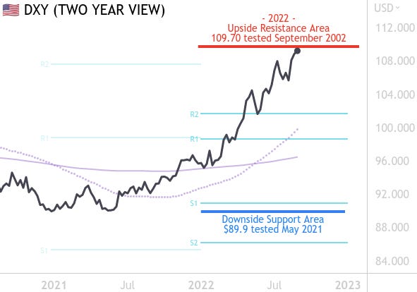 This year, the momentum remains bullish which is now in alignment with the trajectory which turned bullish in May. This indicates that the upside resistance area at $109.7 is being targeted which was previously tested twenty years ago in September 2002.