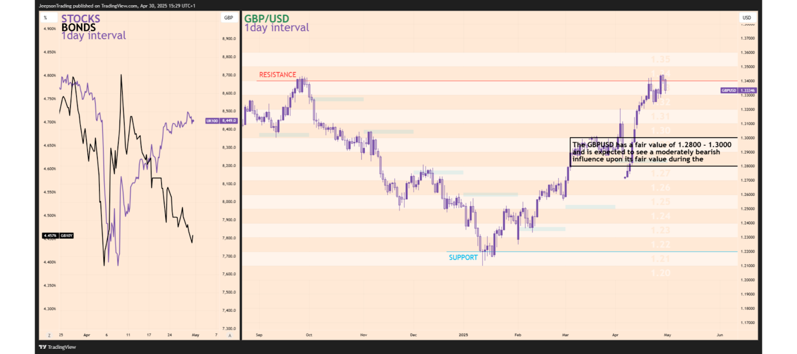 The move towards the 1.3450 resistance in late April 2025 was primarily triggered by sharp, broad-based US dollar weakness stemming from heightened concerns about US political stability and Federal Reserve independence. The subsequent failure to break higher resulted from a combination of a recovering US dollar (on shifting trade narratives) and the release of very weak UK flash PMI data on April 23rd, which significantly increased expectations for Bank of England rate cuts.