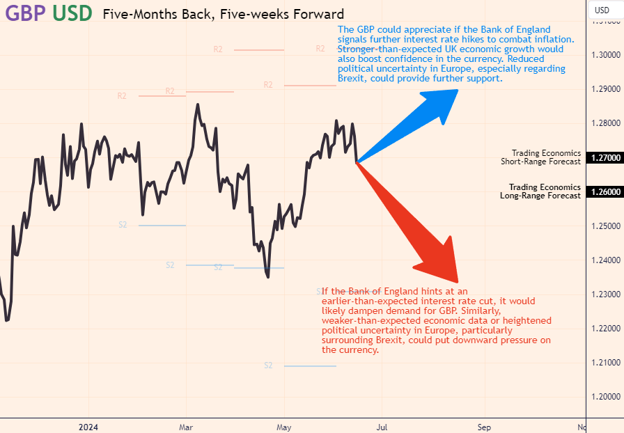 The outlook for the GBP over the next five weeks is uncertain, with a number of factors likely to influence its direction. The upcoming BoE monetary policy announcement on 20th June will be a key event to watch.